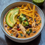 Ladle the chili into bowls. Top each serving with your choice of tortilla strips, shredded cheese, sliced avocados, a squeeze of fresh lime juice, and chopped cilantro for added flavor and texture.